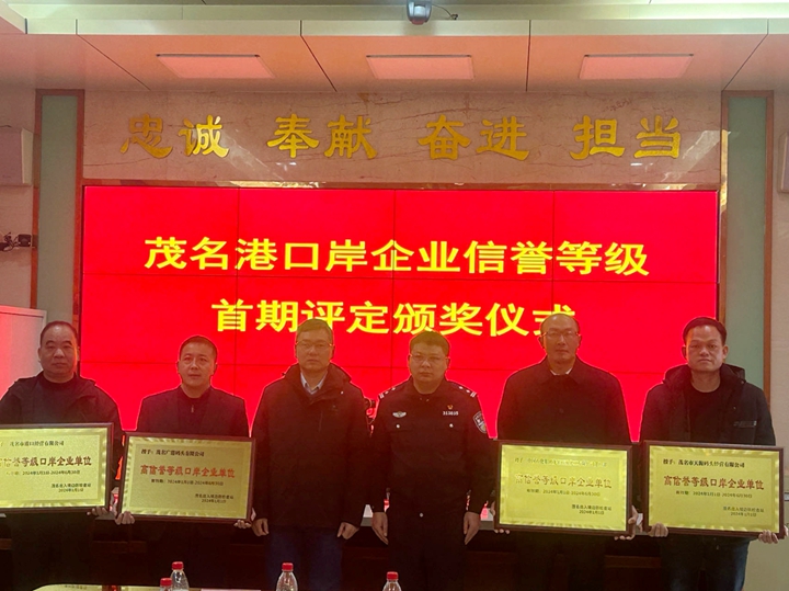 1月25日,口岸企業(yè)信譽(yù)等級評定暨口岸安全管控工作座談會在茂名出入境邊防檢查站隆重召開,集團(tuán)下屬企業(yè)茂名市港口經(jīng)營有限公司榮獲茂名出入境邊防檢查站首批“高信譽(yù)等級口岸企業(yè)單位”!會上,茂名出入境邊防檢查站、茂名市商務(wù)局及茂名市各口岸企業(yè)一起共謀口岸經(jīng)濟(jì)發(fā)展之路,共商口岸安全管控之計(jì),并對茂名港口岸范圍評選出的首批四家高信譽(yù)等級口岸企業(yè)進(jìn)行了表彰。