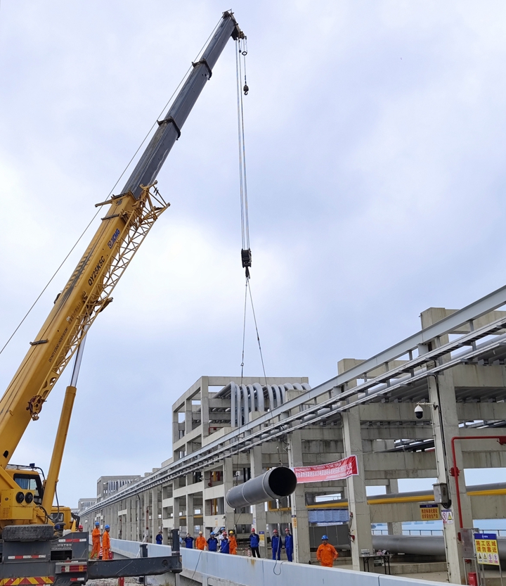 據(jù)悉,30萬噸級原油碼頭工程設置2根DN900的原油運輸主管,起點為30萬噸級原油碼頭E1泊位,終點為東防波堤堤根的公用管廊終點,原油管線總長度約為6km,此次施工吊裝的首根原油管道長約12.29米,重約3.46噸。公共管廊處管線多,作業(yè)空間狹隘,需要在保護已有管線設備的前提下進行安全精準化吊裝作業(yè),對此,臨時黨支部多次協(xié)調(diào)組織監(jiān)理單位、施工單位和運營單位的專業(yè)人員提前規(guī)劃管道吊裝方案,協(xié)調(diào)組織各方專業(yè)人員現(xiàn)場值守,從而保障管道吊裝作業(yè)安全可控地順利開展。